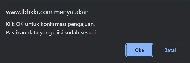 Saat muncul jendela konfirmasi pengajuan, klik tombol OK jika data yang diisi sudah sesuai atau klik tombol BATAL jika ingin mengedit data.